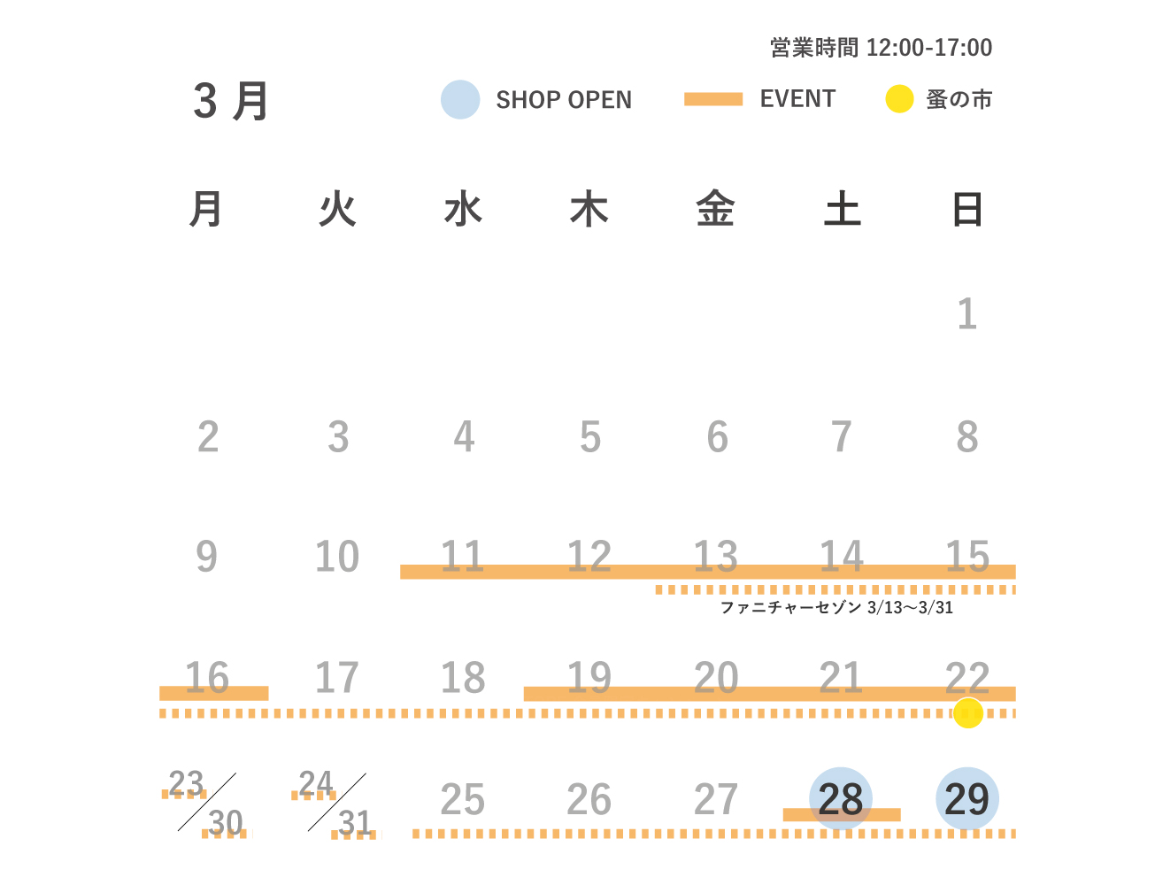 3月と4月の営業日カレンダーをアップいたしました。イベントなどによりオープン日が少なくなっております。ご来店の際は事前に営業日をご確認くださいませ。皆さまのご来店をお待ちしております。