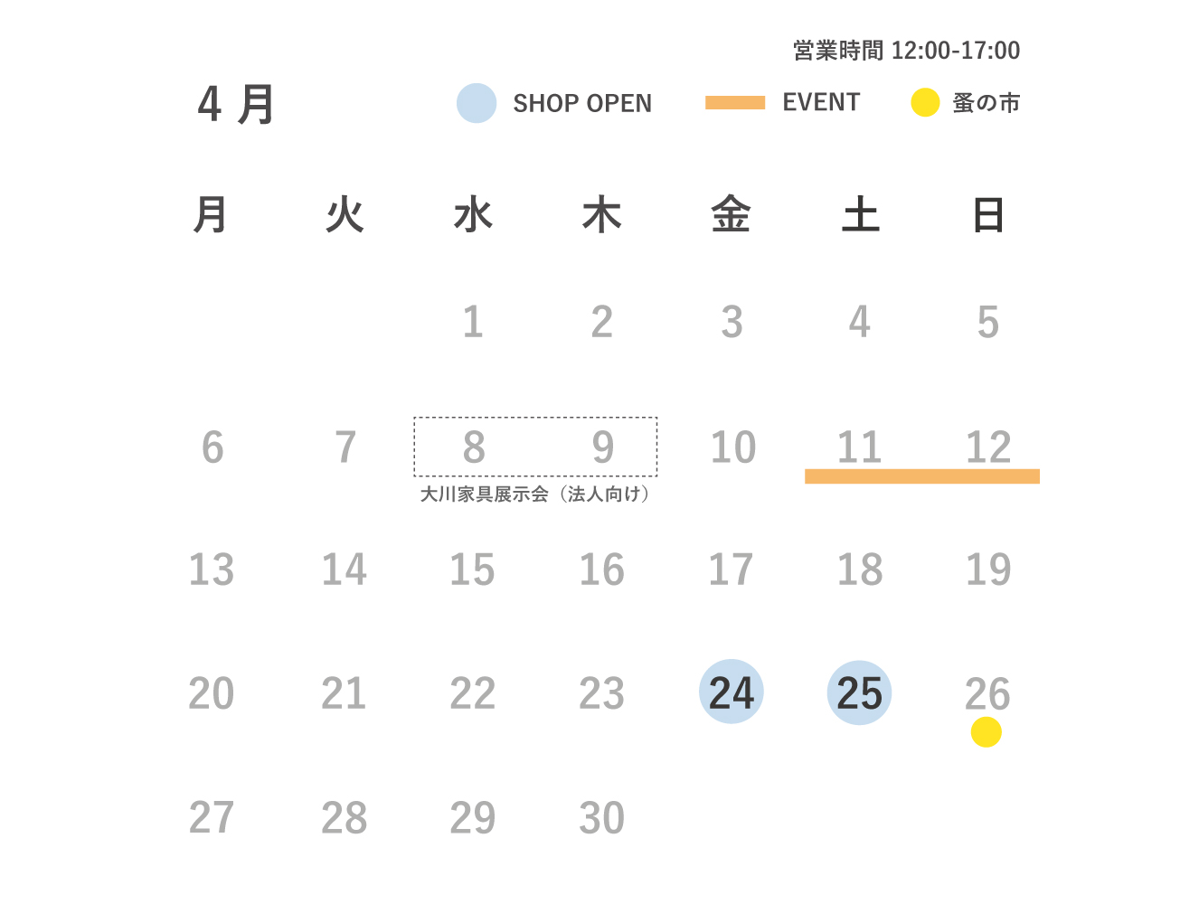 営業日とイベント情報をお知らせいたします。