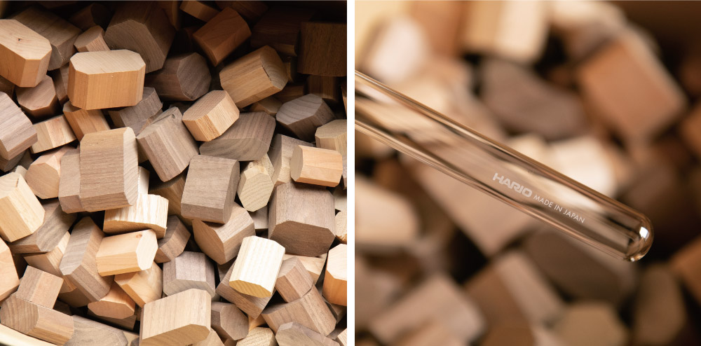 “ エコフレンドリー ” をテーマに、木材は全て家具を製作した際に出る “ 端材 ” をひとつひとつ細かく裁断して活用しています。また、試験管にもこだわり、耐熱ガラスメーカーHARIOさんの “ 耐熱リサイクルガラス試験管 ” を採用。割れてしまったガラスなどの廃材を活用しています。そんなリサイクル素材たちを使って、世界にひとつしかない自分だけのフラワーベースを作ることができます。